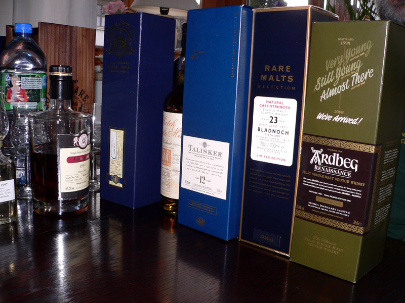 Soweit ist unser Line-up schon gediehen: Lowlands: Bladnoch Rare Malt OA 1977, 23 Jahre, 53.6% Campbeltown: Glen Scotia A. D. Rattray 1992, 17 Jahre Dark Sherry Cask, 59.4% Inseln: Talisker G&M 'Secret Stills', 21 Jahre First Fill Sherry, 45% Highlands: ...noch offen... Speyside: 35.25 SMWS, 10 Jahre First Fill Bourbon, 59.1% Islay: ...noch offen...wird aber von Rainer besorgt:-) Danach folgte ein munteres Verkosten von z.B. dem 20er Macallan von WhiskyDoris, dem 12er Benriach DT NC2 auch von WD, dem 26er Rare Auld CI von DT, dem Bowmore OA 15 Darkest und ein paar anderen... |