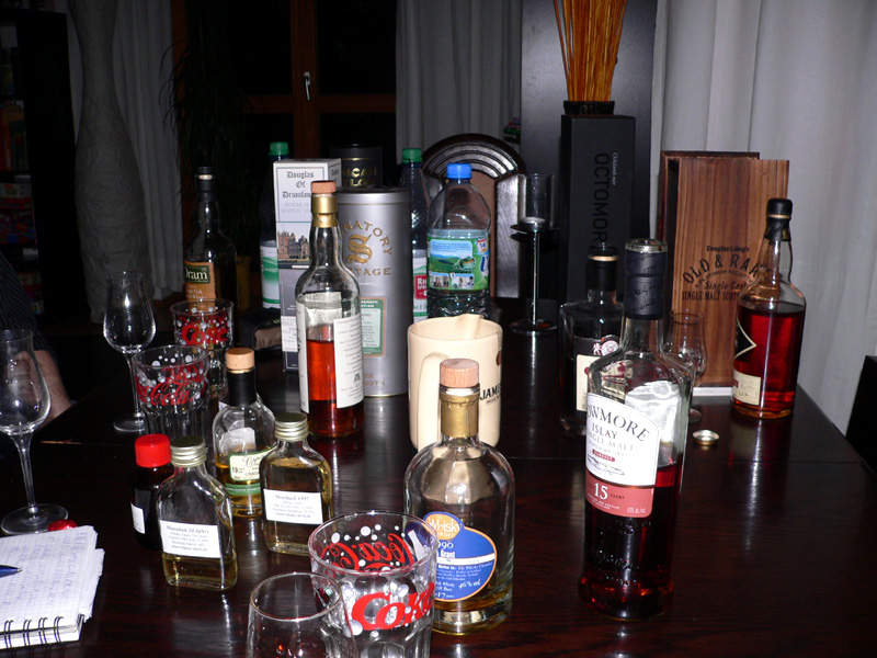 | Wir trafen uns, um das Thema oder die Richtung für unser nächstes Tasting in Angriff zu nehmen. Dabei legten wir uns schon einmal auf eine erneute 'Schottland-Rundreise' quer durch alle Regionen fest. Auch einige der in Betracht kommenden und schon vorhandenen Flaschen wurden auf ihre Eignung überprüft. Die noch fehlenden regionalen Abfüllungen werden im Laufe des Sommers besorgt, sodaß wir dann die endgültige "Marschroute" festlegen werden. Die Stationen 'Lowland' und 'Campbeltown' stehen fest, das Übersetzen auf die Insel 'Islay' war noch nicht möglich. Auch in den 'Highlands' irren wir bei der Weitläufigkeit noch ein wenig umher. Klarheit herrscht hingegen bereits in der 'Speyside' und dem Abstecher auf die 'Inseln'. Wir haben uns die Sache mal wieder nicht leicht gemacht, wie die nachstehenden Bilder verdeutlichen...! |