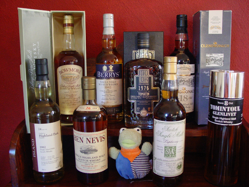 | 1. Tomintoul OB 8 y.o. "Perfume Bottle" from 1970ies, 75cl, 43 gradi (Donato-Import) 2. Tomatin 34 y.o. Mo'or Collection 1976 - 2011, first-fill sherry butt No.4, 46% 3. Glendronach 18 y.o. OB 1976, sherry casks, 43% 4. Ben Nevis 26 y.o. OB 1973 - 1999, cask 719, 262 btl., 52,0% 5. Highland Park 24 y.o., The Whisky Experience, 25. Oct. 1982 - 17. Sept. 2007, 264 btl., 54,9% 6. Bowmore 21 y.o. OB 1971, 75cl, 43% 7. Caol Ila 28 y.o. Berry Bros. & Rudd, 1982 - 2011, Cask 6514, 56,4% 8. Laphroaig SSMC 23. March 1998 - 4. Aug. 2010, sherry cask 800043, 294 btl., 59,9% |