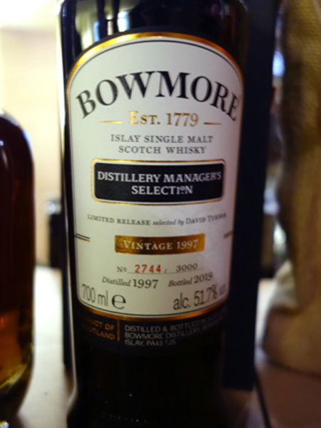 Die direkt von Bowmore importierte 'Distillery Managers Selection' war wiederum ein ganz besonderes Kaliber. 1997 destilliert und nach 21 Jahren Reifung in Oloroso Sherry Hogsheads mit 51.7% in insgesamt 3000 Flaschen gekommen. Ein sehr dunkles Teil, bei dem man prächtig mit Wasser experimentieren konnte!