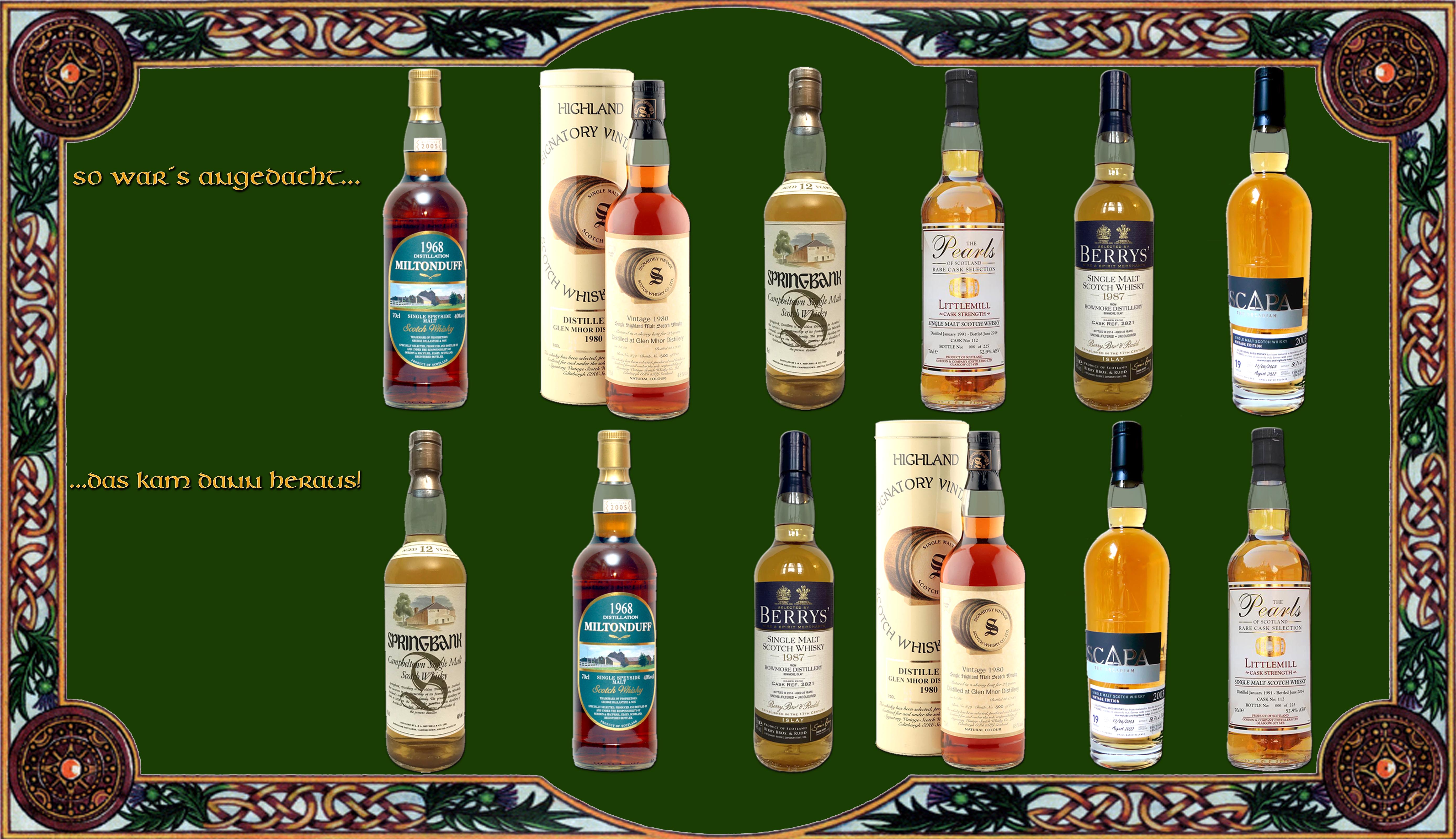 Im April findet wieder ein reguläres (Frühjahrs-)Tasting statt. Das Lineup ist noch in Arbeit und wird voraussichtlich Ende Januar hier erscheinen. Wie immer basteln wir noch an einer vernünftigen Reihenfolge. Der Termin steht jetzt endgültig fest, es ist der 12. April, der den meisten Gästen gepasst hat. Es gelten wieder die gewohnten Regeln und die Teilnehmerzahl ist auf 20 Personen limitiert. Auch der Preis richtet sich nach dem Angebot, es sind aber einige Abfüllungen dabei, die nur aus dem UK, aus bereits lange geschlossenen Brennereien kommen, oder einfach Raritäten sind, die nur noch schwer oder eben teuer zu bekommen sind. Der Preis für die Teilnehmer geht aber nicht über das Vorjahresniveau hinaus. Bei Interesse einfach eine Mail an: Frühjahrstasting in Heng. Das weitere 'Drumherum' bleibt auch wie gehabt.