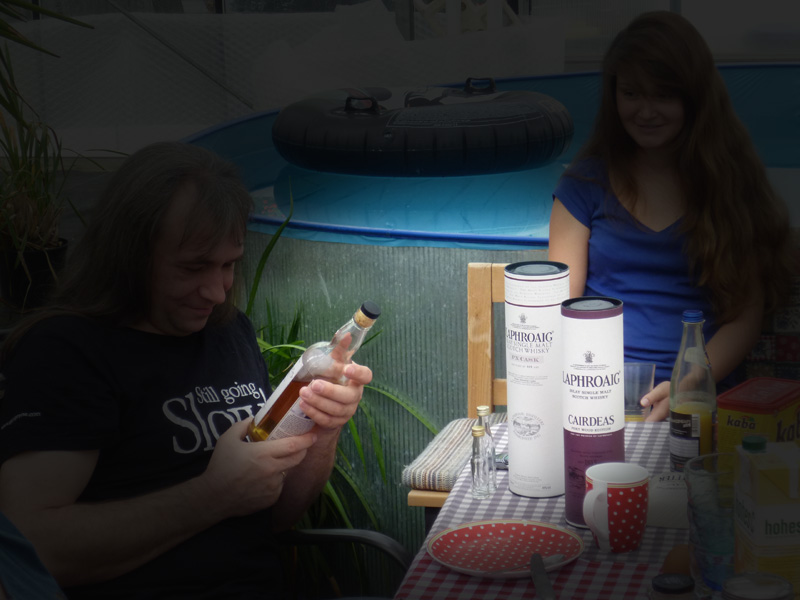 'Frühstück' (v.l.): Snowdens Reserve, Laphroaig PX, Laphroaig Cairdeas, Orangensaft, Kaba... |