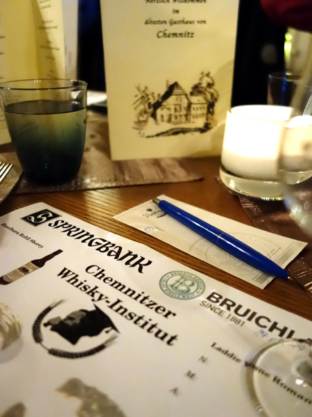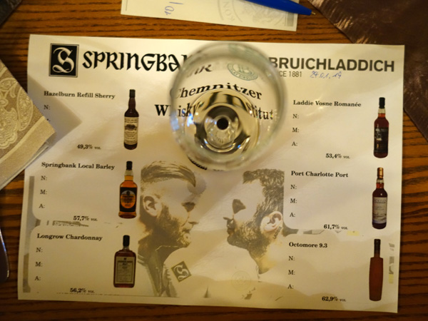 Winterreise 2019: Diesmal fuhren wir gen Sonnenaufgang und besuchten die Chemnitzer Freunde bei einer ihrer Zusammenkünfte. Sie waren wirklich gut drauf und wir haben viel gelacht (Boni - der geborene Entertainer). Das Thema war: Springbank vs. Bruichladdich, zwei Destillerien, die jeweils drei verschiedene Malts herstellen. Dabei wurde es auch wieder ernst - die gegeneinander antretenden Whiskys wurden durchaus kontrovers diskutiert. Das hat Freude gemacht und bei Gelegenheit werden wir wiederkommen...!